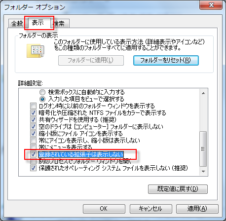- 詳細設定欄の[登録されている拡張子は表示しない]のチェックマークを外します。